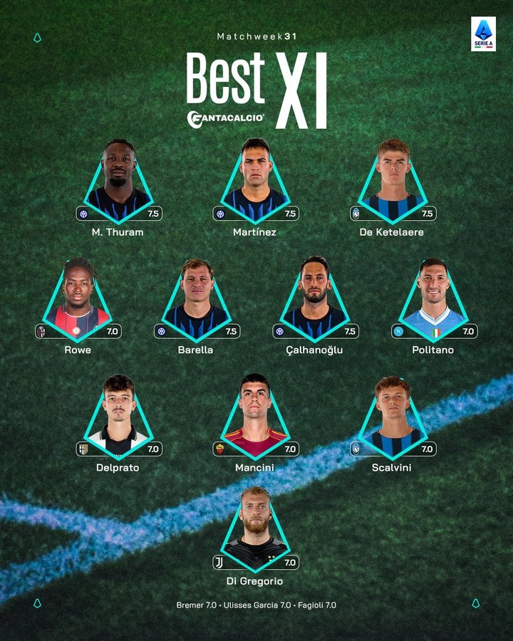 4月7日讯 意甲官方公布第31轮最佳11人阵容,国米4人入选。门将:迪格雷戈里奥(尤文图斯)后卫:德尔·普拉托(帕尔马)、詹卢卡·曼奇尼(罗马)、斯卡尔维尼(亚特兰大)中场:乔纳森·罗(博洛尼亚)、巴雷拉(国米)、恰尔汗奥卢(国米)、波利塔诺(那不勒斯)前锋:图拉姆(国米)、劳塔罗(国米)、德凯特拉雷(亚特兰大)...